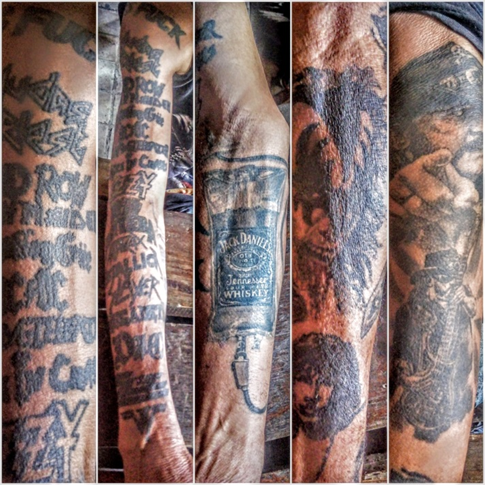 Angelo llega al Mejunje y, como no ve bien de lejos, todos lo saludan antes que sus ojos se acostumbren a la iluminación del Patio. Es temprano (sobre todo para él), cerca de las diez de la mañana. Viene probablemente con la misma ropa de anoche: “Pensaba que no iba a beber, pero me convencieron”. Lleva un t-shirt de Slash, aunque de sobra se sabe que tiene gustos más exquisitos (su tatuaje de la guitarra Dean de Dimebag Darrell es prueba de ello) y un nasobuco sucio (los que lo conocen, dirán que “ahí no hay pandemia que entre”).