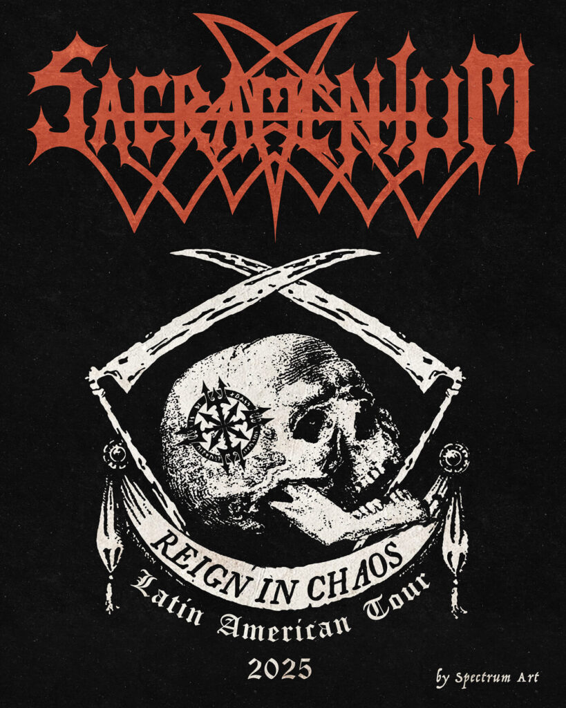Mi acercamiento con Sacramentum sucedió gracias al cartel oficial de un evento en México llamado Total Death, del cual la banda iba a formar parte como invitada especial. Estuve a cargo de la realización del flyer oficial de ese festival y a raíz de eso, fuii contactado directamente por Nisse Karlens (vocalista y fundador de Sacramentum, y quien se ha convertido en un buen amigo y hermano), para realizar un diseño especial de t-shirt para su primera vez en México.